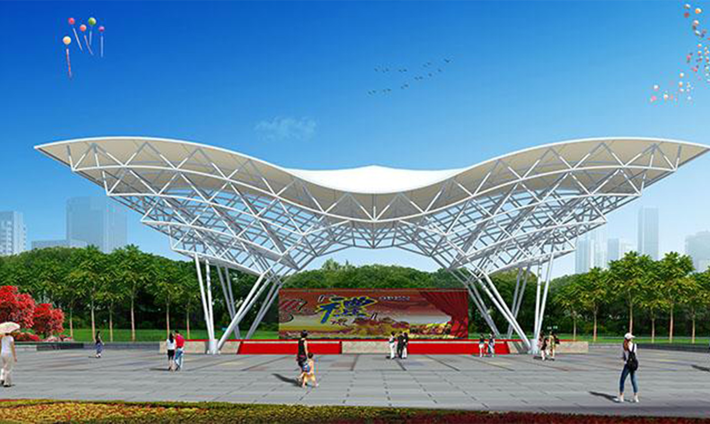 1、舞臺張拉膜結構的共同曲面外形使其具有激烈的雕塑感,膜面經過張力到達自平衡。
