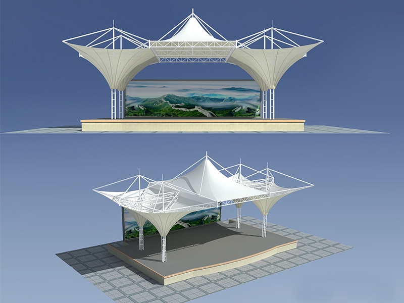 1、舞臺張拉膜結構的共同曲面外形使其具有激烈的雕塑感,膜面經過張力到達自平衡。