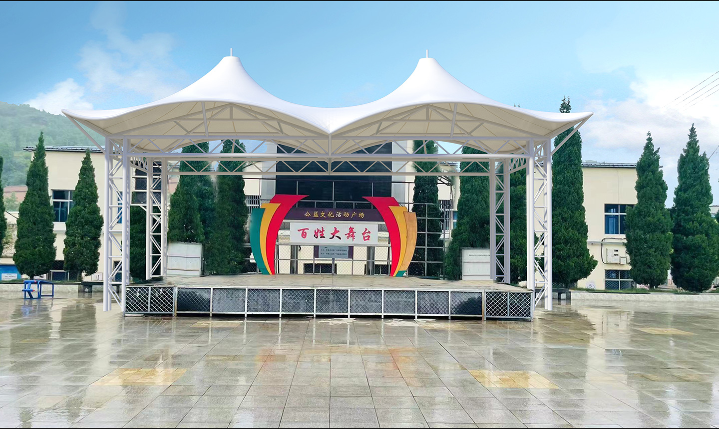 1、舞臺(tái)張拉膜結(jié)構(gòu)的共同曲面外形使其具有激烈的雕塑感,膜面經(jīng)過張力到達(dá)自平衡。