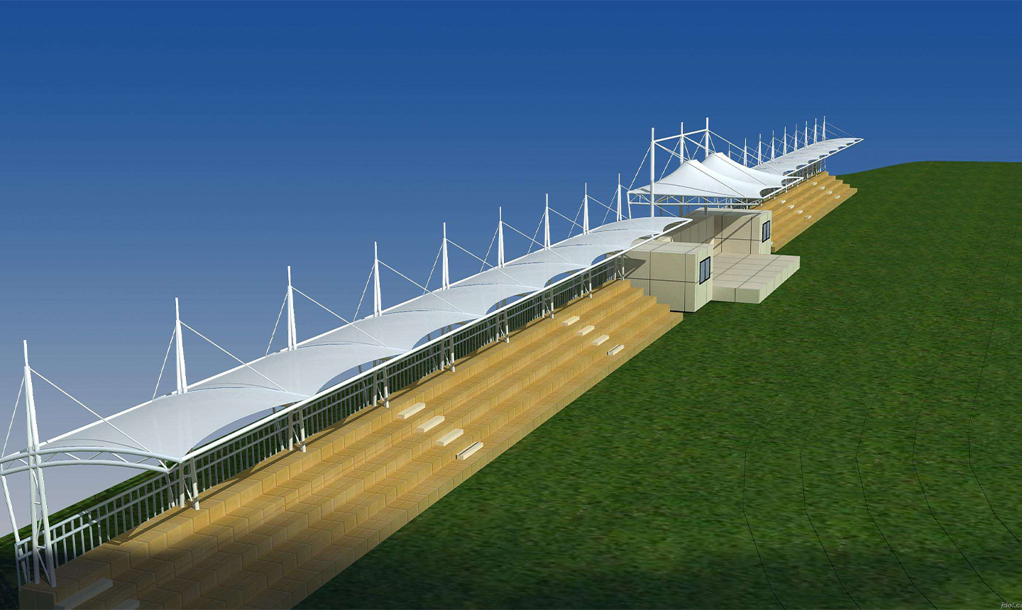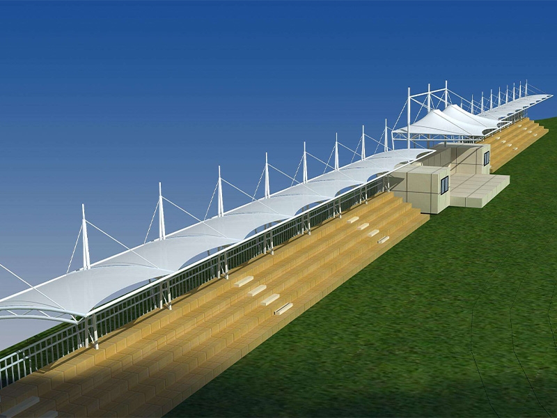 2、體育膜結(jié)構(gòu)看臺的外觀設(shè)計一向都是露天的,所以在設(shè)計的時候我們需要注意它的承重力,因?yàn)橐话愣际菃蝹?cè)建造或者環(huán)繞建造,必須有無數(shù)個支撐點(diǎn)才能讓整個頂子具有強(qiáng)抗風(fēng)、抗震的功能 體育場看臺一般都是高大上的感覺,外觀別具特色,實(shí)用性也不錯。同時這種看臺在夏季比賽的時候,觀眾特別希望可以坐在遮陽效果好的一面,那么我們就需要把這些因素考慮進(jìn)去。盡量讓設(shè)計大面積的有遮陽效果,最后在膜結(jié)構(gòu)裁剪的時候要量好尺寸,這樣每塊材料才能很好的焊接成功。做到這些,一個完美又實(shí)用的體育場看臺就會很快展現(xiàn)在眼前了。