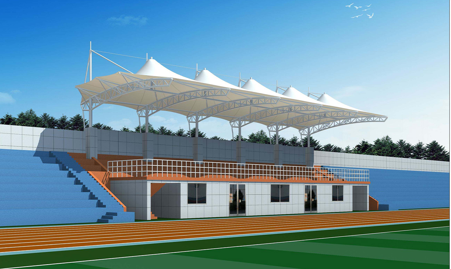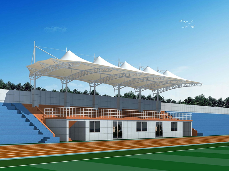 2、體育膜結構看臺的外觀設計一向都是露天的,所以在設計的時候我們需要注意它的承重力,因為一般都是單側建造或者環繞建造,必須有無數個支撐點才能讓整個頂子具有強抗風、抗震的功能 體育場看臺一般都是高大上的感覺,外觀別具特色,實用性也不錯。同時這種看臺在夏季比賽的時候,觀眾特別希望可以坐在遮陽效果好的一面,那么我們就需要把這些因素考慮進去。盡量讓設計大面積的有遮陽效果,最后在膜結構裁剪的時候要量好尺寸,這樣每塊材料才能很好的焊接成功。做到這些,一個完美又實用的體育場看臺就會很快展現在眼前了。