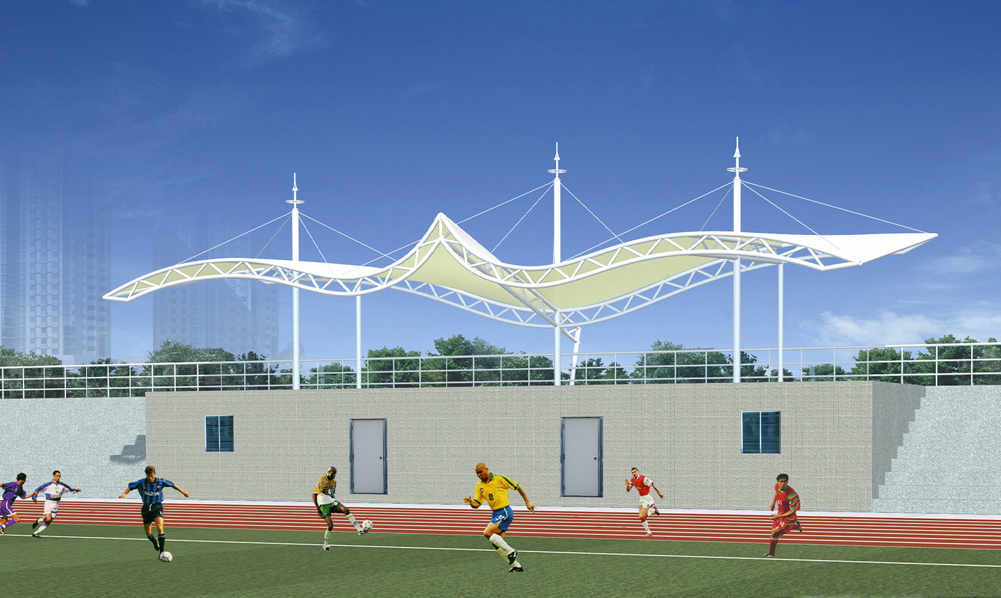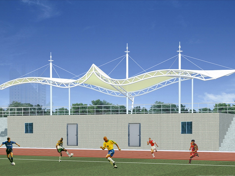 2、體育膜結(jié)構(gòu)看臺(tái)的外觀設(shè)計(jì)一向都是露天的,所以在設(shè)計(jì)的時(shí)候我們需要注意它的承重力,因?yàn)橐话愣际菃蝹?cè)建造或者環(huán)繞建造,必須有無(wú)數(shù)個(gè)支撐點(diǎn)才能讓整個(gè)頂子具有強(qiáng)抗風(fēng)、抗震的功能 體育場(chǎng)看臺(tái)一般都是高大上的感覺,外觀別具特色,實(shí)用性也不錯(cuò)。同時(shí)這種看臺(tái)在夏季比賽的時(shí)候,觀眾特別希望可以坐在遮陽(yáng)效果好的一面,那么我們就需要把這些因素考慮進(jìn)去。盡量讓設(shè)計(jì)大面積的有遮陽(yáng)效果,最后在膜結(jié)構(gòu)裁剪的時(shí)候要量好尺寸,這樣每塊材料才能很好的焊接成功。做到這些,一個(gè)完美又實(shí)用的體育場(chǎng)看臺(tái)就會(huì)很快展現(xiàn)在眼前了。