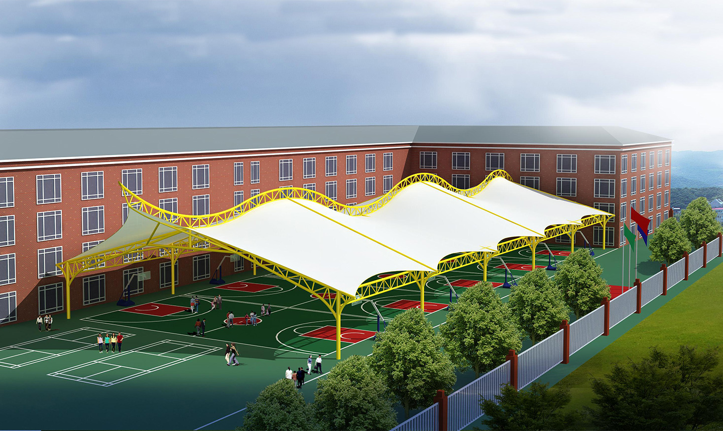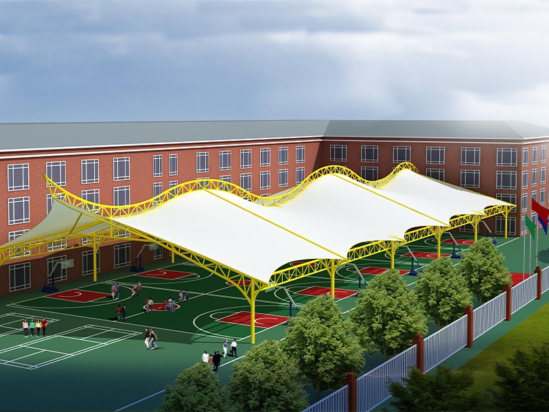 一、對于場地要求低,基本上所有球場地都可以做膜結構頂棚,相比混凝土結構的風雨球館,施工周期短,造價低。