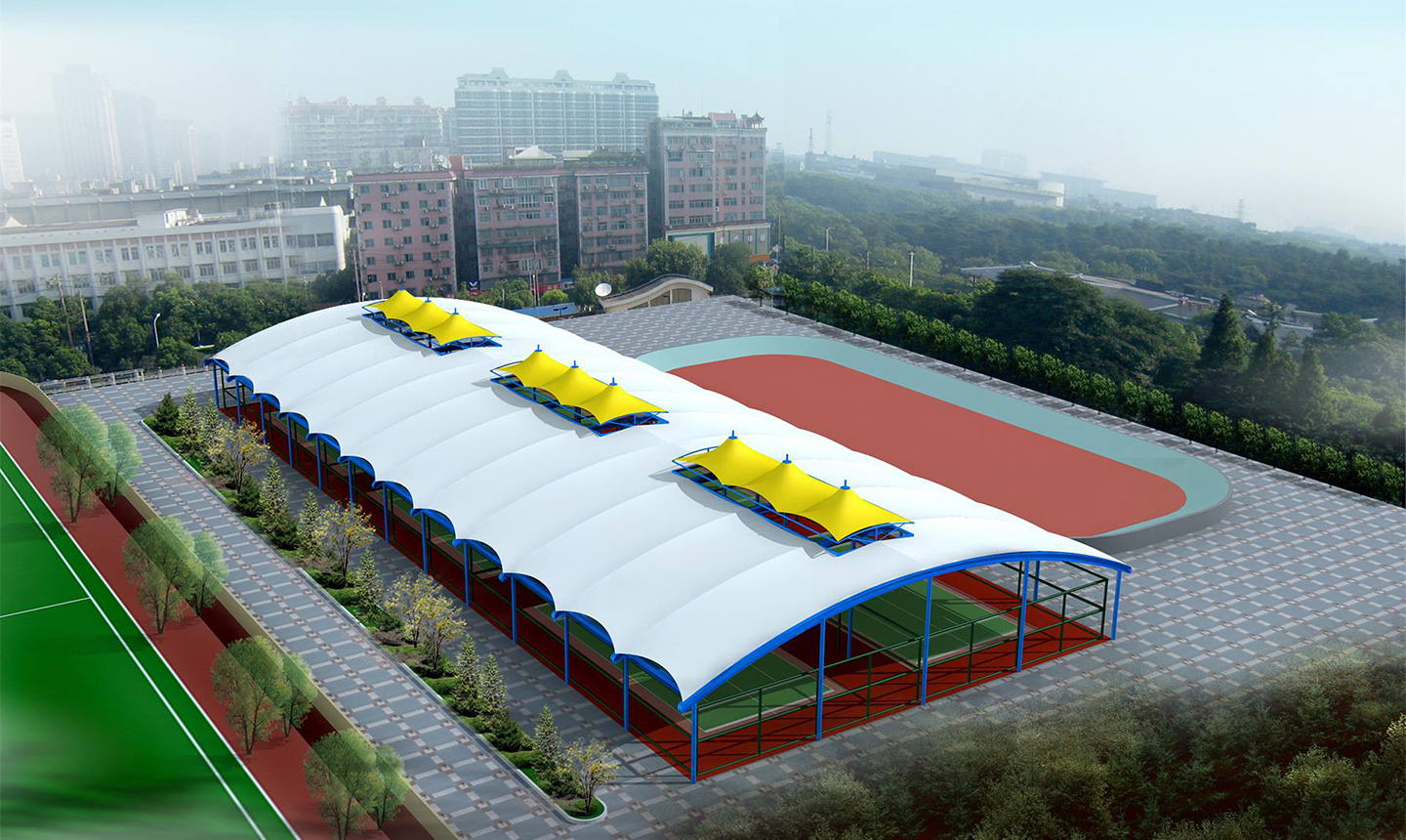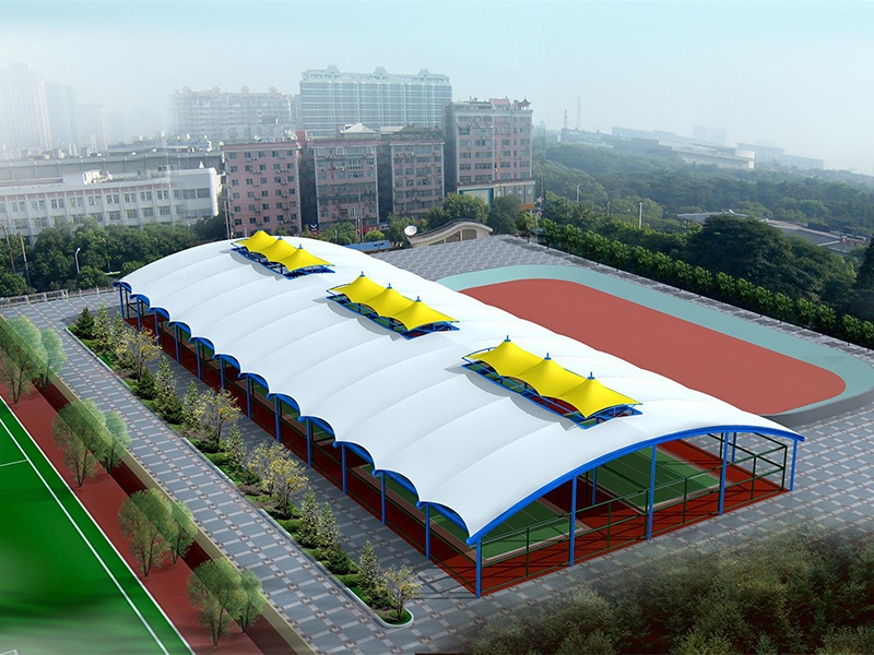 一、對于場地要求低,基本上所有球場地都可以做膜結構頂棚,相比混凝土結構的風雨球館,施工周期短,造價低。