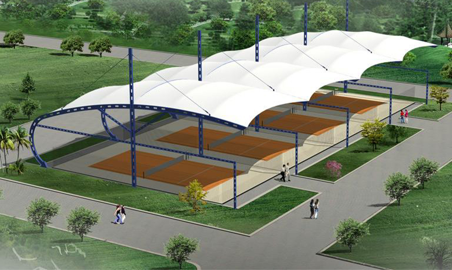 一、對于場地要求低,基本上所有球場地都可以做膜結構頂棚,相比混凝土結構的風雨球館,施工周期短,造價低。