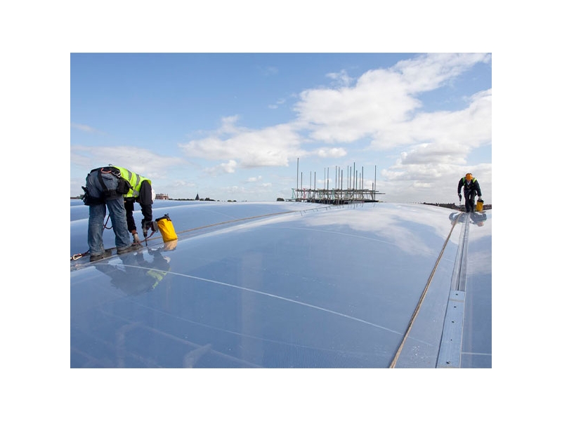 “ETFE”是英文Ethylene Tetra Fluoro Ethylene的縮寫,中文名稱為乙烯-四氟乙烯共聚物。ETFE膜材具有較高的抗拉強度、抗沖擊強度及抗撕裂能力。ETFE膜材的厚度通常在0.05~0.25mm。隨著厚度的增加,膜材的硬度將增加,同時也更脆,增大了加工難度。ETFE材料的典型用法是,將兩層或三層膜材“焊接”在一起,運送到工地,然后充氣使它們膨脹成氣枕。