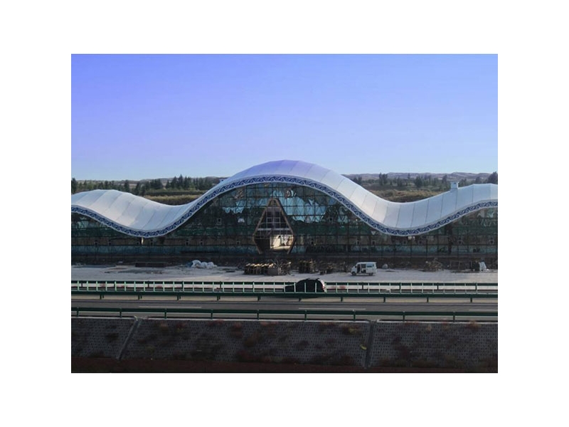 PTFE膜材的最大特點是強度高、耐久性好、防火難燃、自潔性好,不受紫外線影響,使用壽命在25年以上。具有高透光率,透光率為13%, 對熱能反射率73%,熱吸收量很少。正是因為這種劃時代的膜材料的發(fā)明,使膜結(jié)構(gòu)建筑成為現(xiàn)代化的永久性建筑。