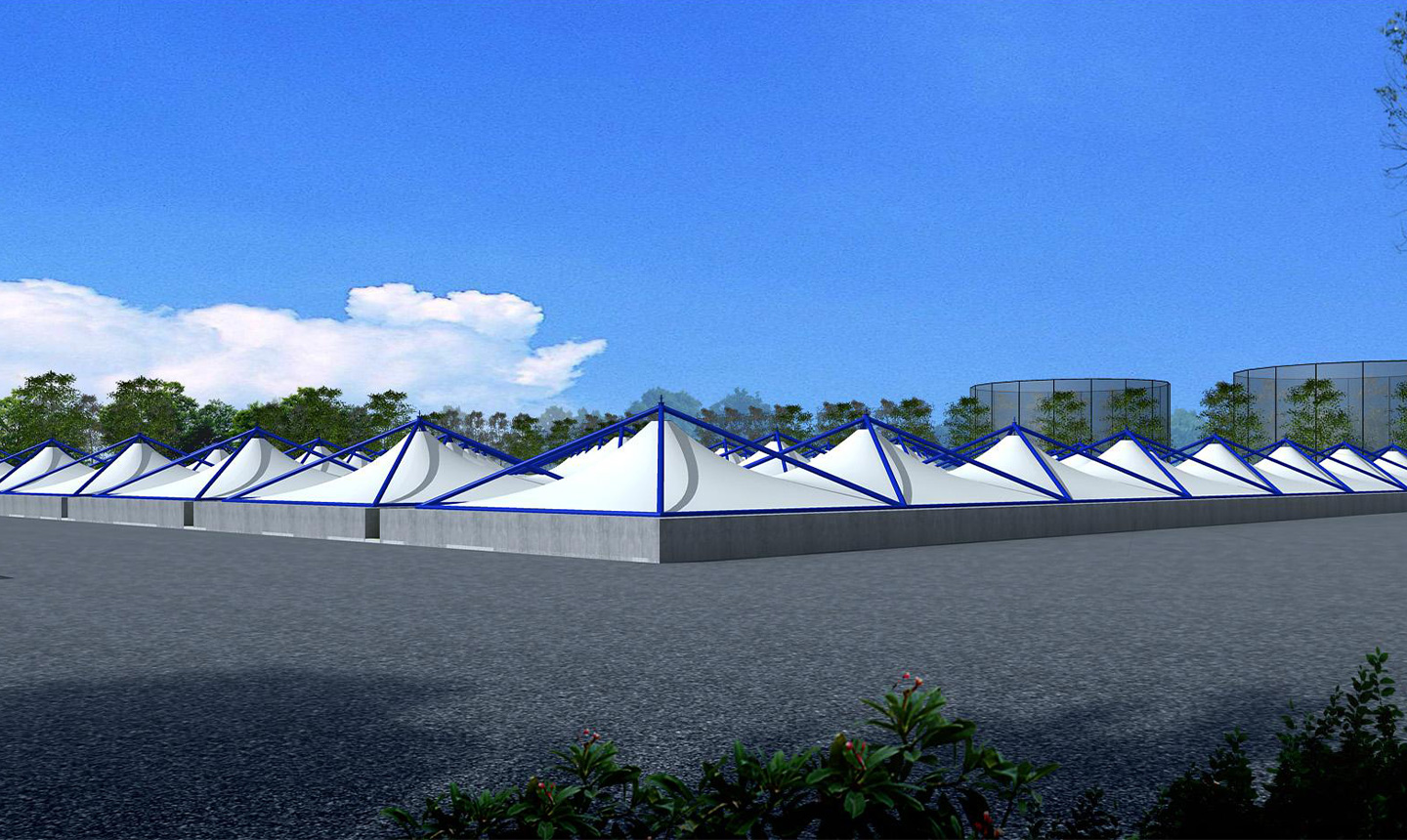 1、適用池體多。反吊膜是以鋼結構為支撐,膜材料反吊的方式進行設計安裝的污水池加蓋方式,此種  方式,可根據所有池體的不同情況進行定制,比如:跨度、形狀等。由于膜結構自重輕,自潔性高,耐腐蝕性好,對污水池加蓋封閉做到密封嚴實,結構上的要求一般都能滿足需求,但是不斷創新的形體結構也是污水池反吊膜的靈魂所在,也是污水池反吊膜越來越受歡迎的原因
